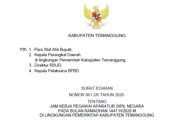 Surat Edaran Bupati Temanggung terkait Jam Kerja ASN pada bulan Ramadhan 1447H/2026 dapat anda unduh dengan mengklik icon download d..