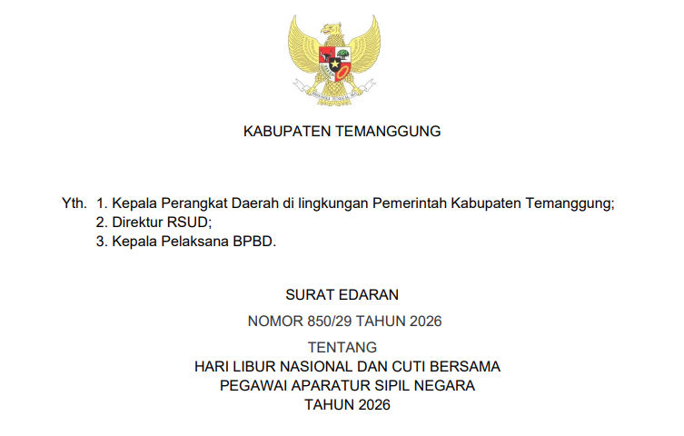 SURAT EDARAN NOMOR 850/29 TAHUN 2026 TENTANG HARI LIBUR NASIONAL DAN CUTI BERSAMA PEGAWAI APARATUR SIPIL NEGARA TAHUN 2026 DAPAT AND..